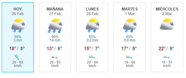 El Servicio Meteorológico Nacional emitió un alerta meteorológico color amarillo por viento para los días sábado 26 por la tarde, domingo por la tarde y noche y el lunes por la mañana. Además se anuncian precipitaciones principalmente el domingo.