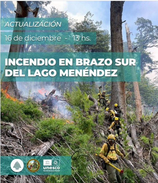 Brigadistas con el apoyo de dos helicópteros y tres aviones combaten el incendio en Lago Menéndez 16 diciembre, 2025