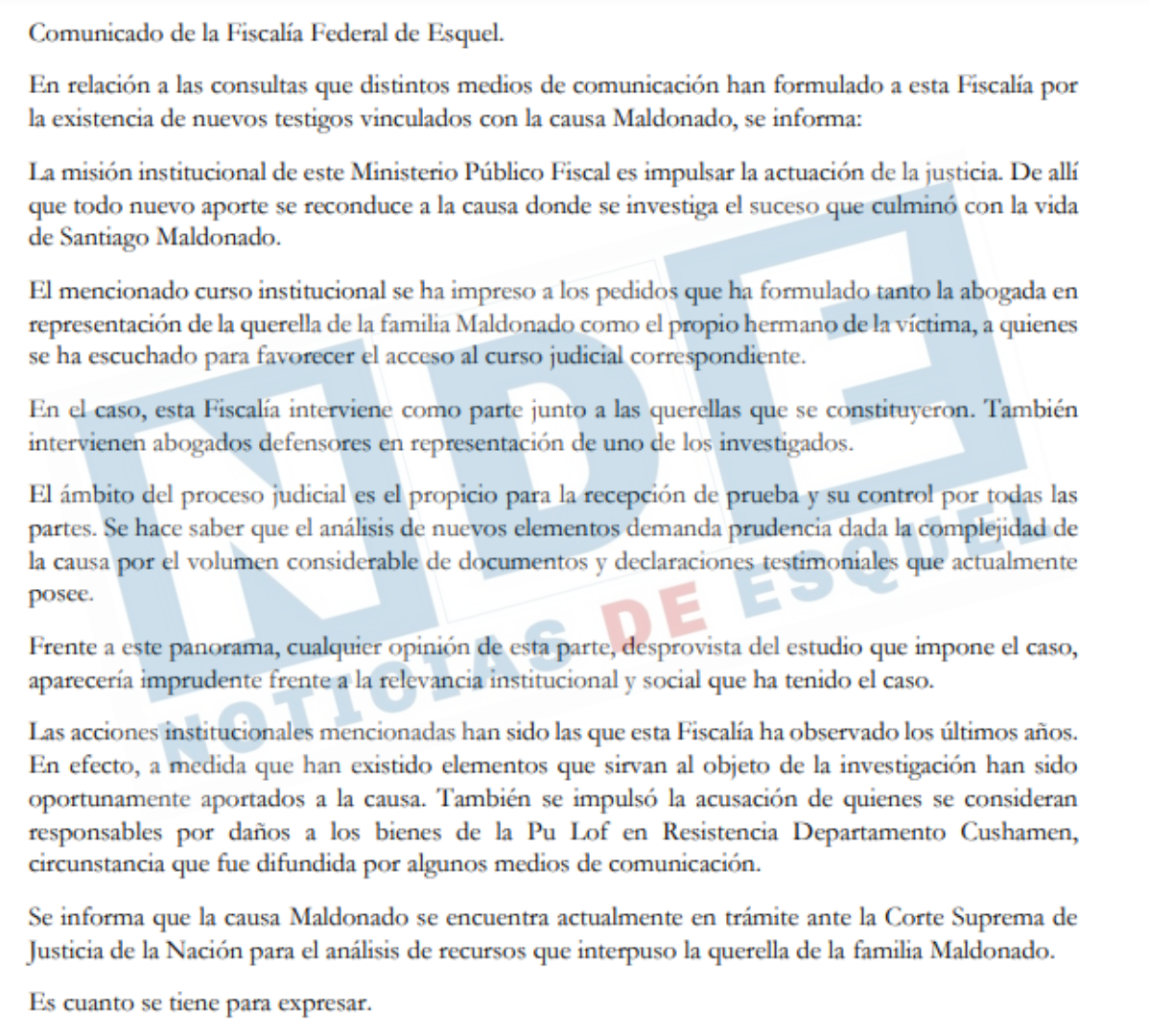 El comunicado del Ministerio Público Fiscal Federal confirma que se produjeron novedades en la causa que estaba paralizada hace tiempo cuando habla de “la existencia de nuevos testigos vinculados a la causa Maldonado”. En el mismo comunicado el MPF reconoce que hay personas sospechadas por la muerte de Maldonado, cuando informa que “esta fiscalía interviene como parte junto a las querellas que se constituyeron. También intervienen abogados defensores en representación de uno de los investigados”.