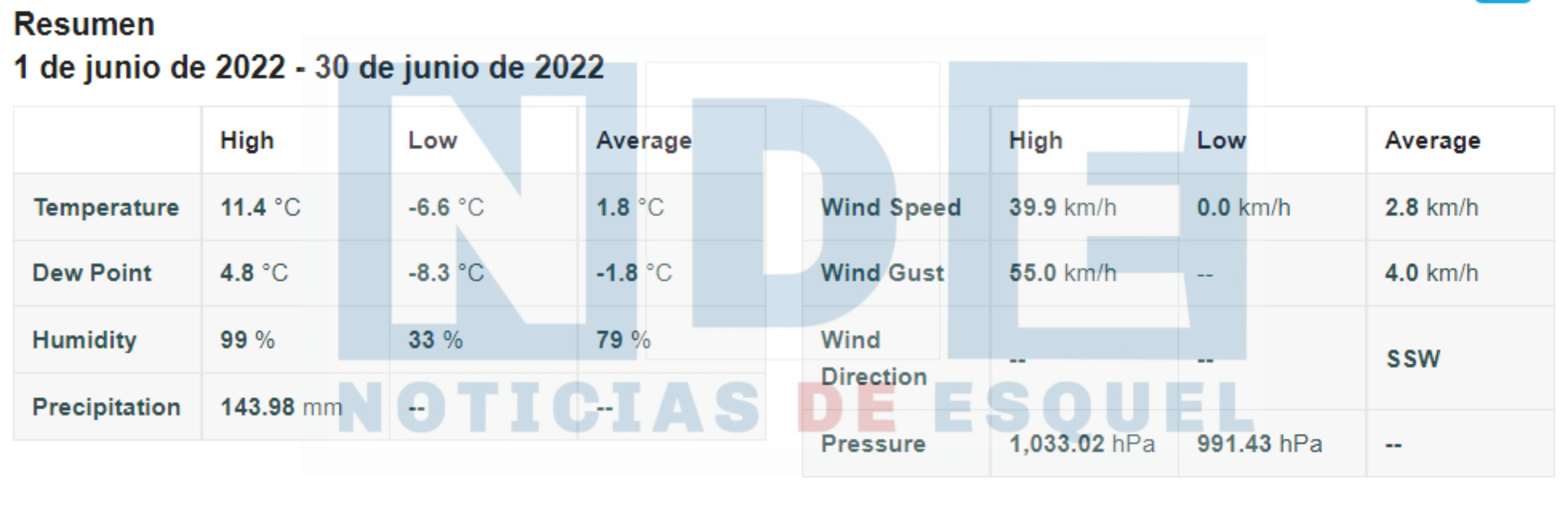 Conocé cuales fueron las condiciones climáticas más destacadas de junio en Esquel, las temperaturas máxima y mínima, cuanto acumuló la lluvia y que velocidad tuvo la ráfaga de viento más intensa. Datos de la Estación Meteorológica Noticias de Esquel.