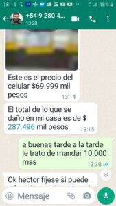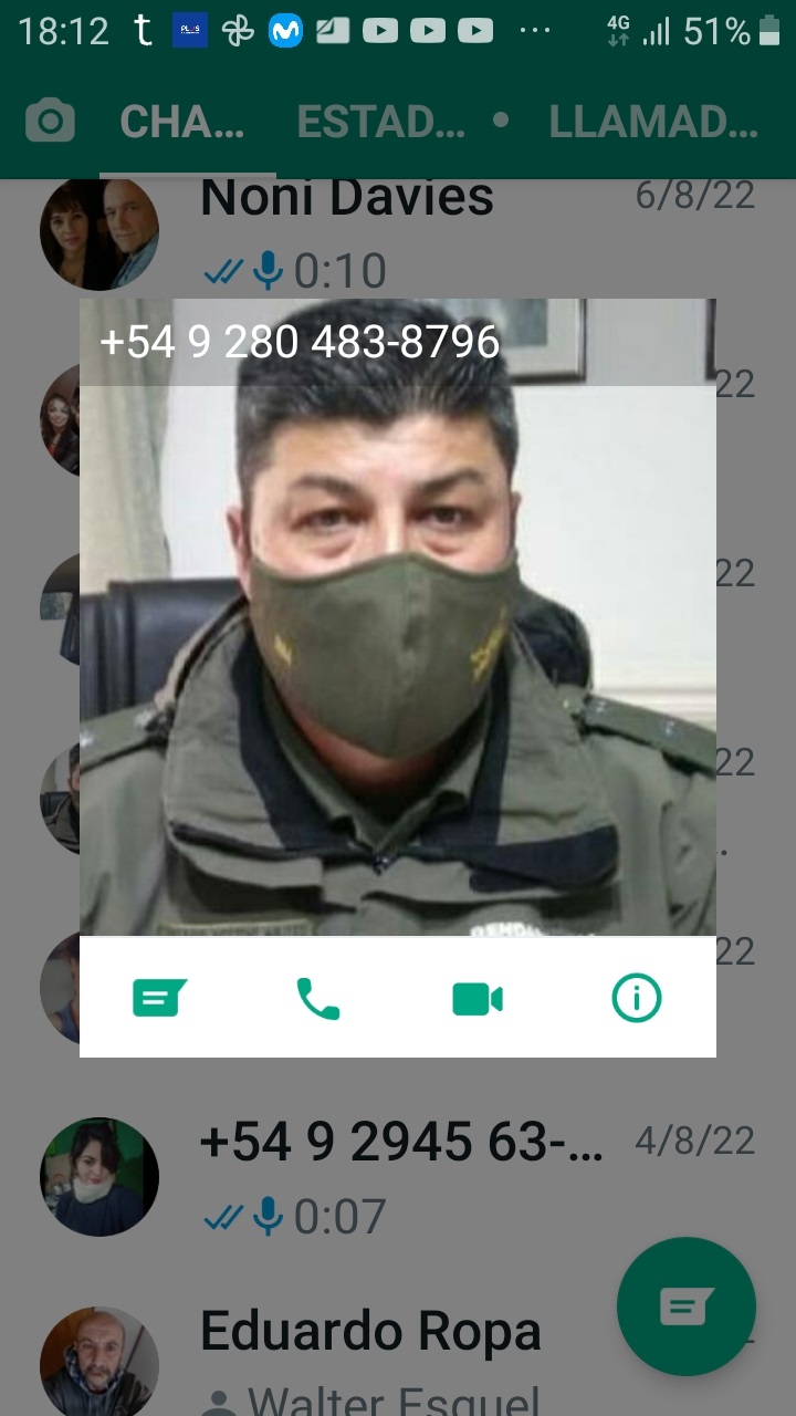 6° Al objetivo lo llamaba un integrante masculino de la banda: y en una llamada de voz le decía: ‘_Soy el papá de XX, ella tiene 14 años!!’ y luego agregaba: ‘_se puso como loca y rompió varias cosas, págame lo que rompió y quedamos así’. En ese momento usaban un número de teléfono con la foto del jefe del Escuadrón 36 Esquel de Gendarmería.
