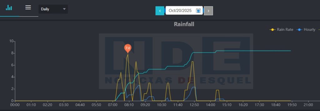 Las precipitaciones en la jornada del lunes, acumularon varios milímetros en nuestra zona. Las primeras lluvias del día se dieron entre las 7 y las 9:30 hs, acumulando unos 5 mm. Luego a las 12 hs volvió a llover otro poco hasta las 12:45 hs aproximadamente. El total acumulado de la lluvia caída el lunes fue de 8.6 mm.