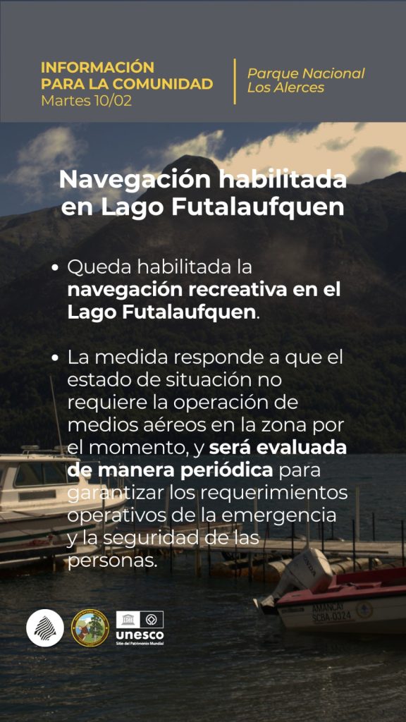En el caso del Parque Nacional Los Alerces, la lluvia que ingresó por el sur mojando muy bien acumuló 13 mm aproximadamente. Además es importante que nevó en los cordones montañosos más altos del PNLA. El pronóstico anuncia probabilidad de lluvias hasta el miércoles. Una buena noticia llegó desde Los Alerces cerca de las 20 hs, cuando se informó que se habilitó la navegación en el Lago Futalaufquen, ya que por el momento no es necesario que operen los medios aéreos.