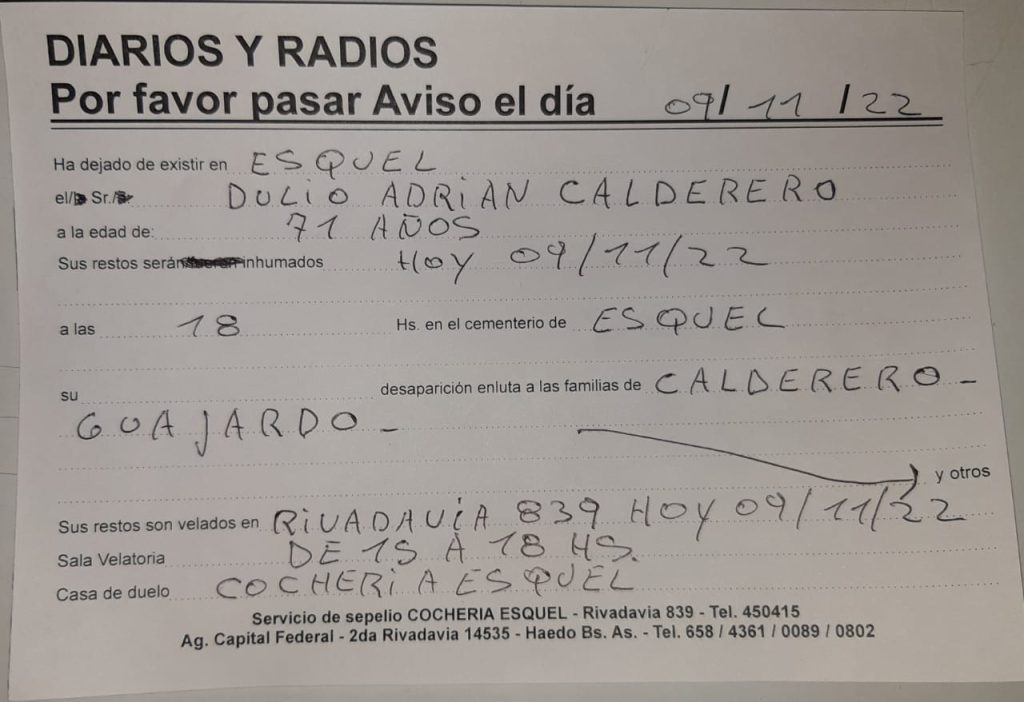 Necrológica. Dulio Adrián Calderero