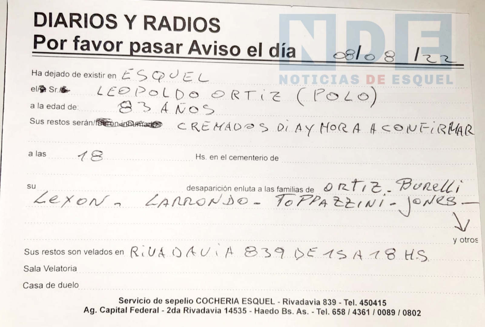 Ha dejado de existir en Esquel el Sr Leopoldo «Polo» Ortiz a los 83 años.