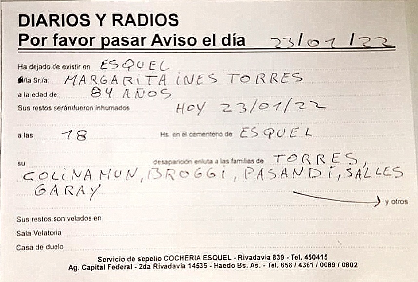 Necrológica. Margarita Inés Torres