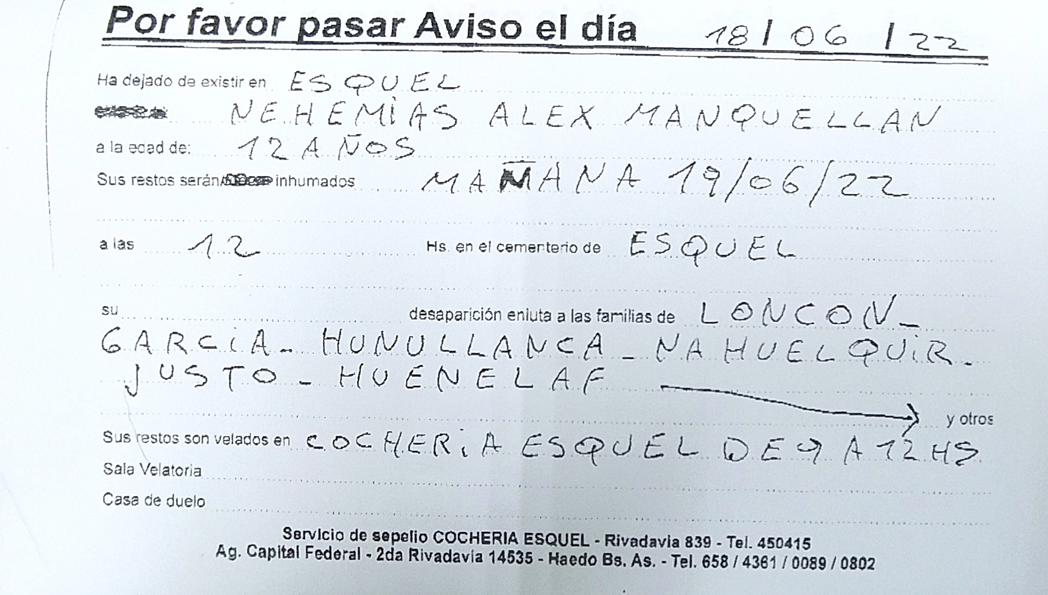 Sus restos serán velados en Cochería Esquel de 9 a 12 hs el domingo 19/6 en Rivadavia 839.