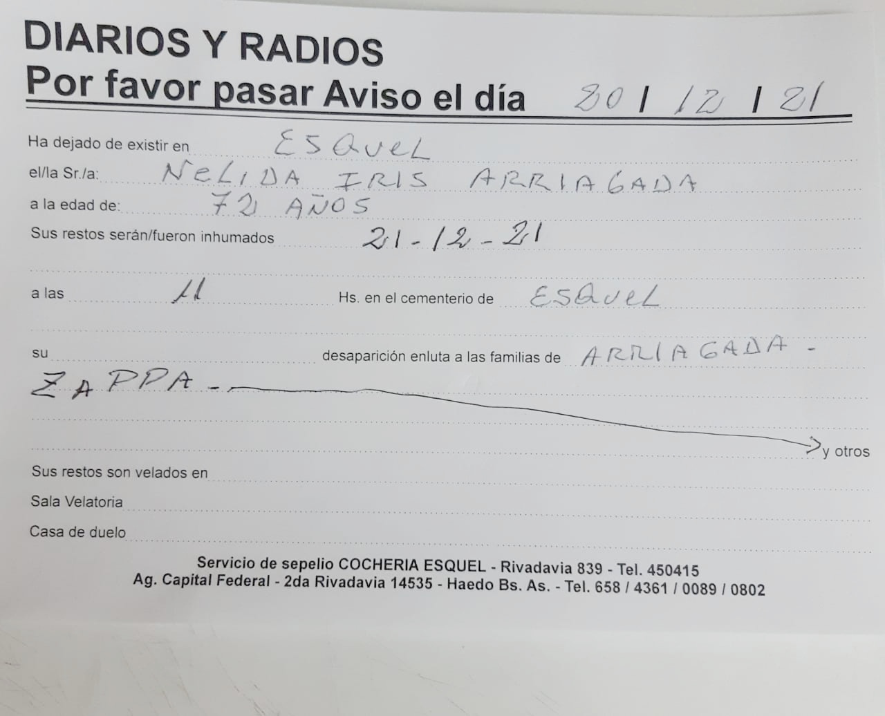 Necrológica. Nélida Iris Arriagada