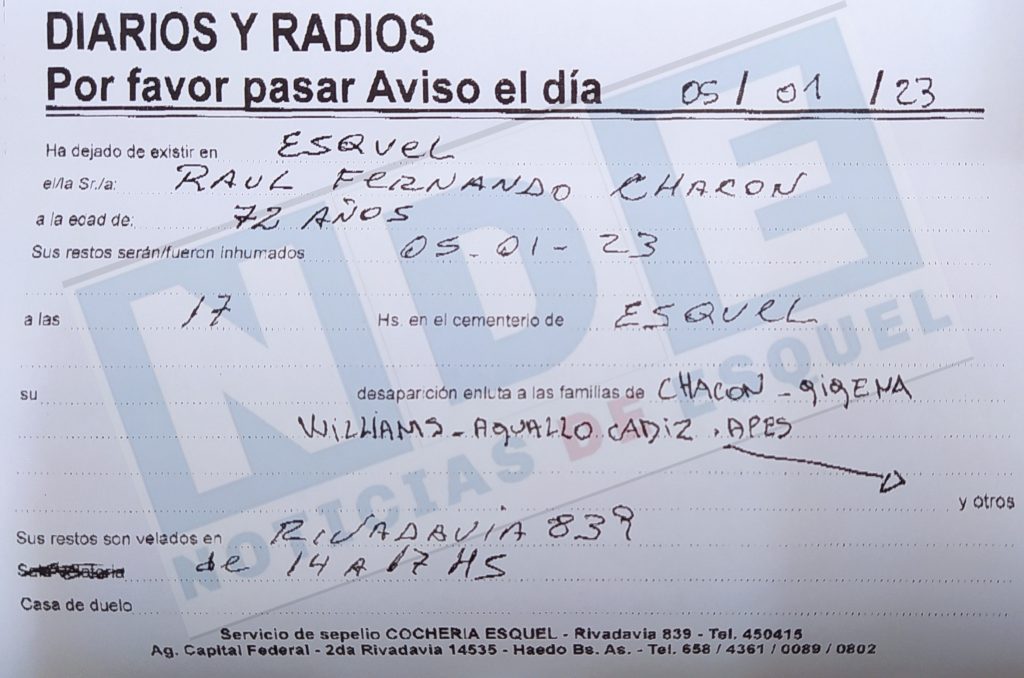 Su desaparición enluta a las familias Chacón, Gigena, Williams, Aguallo, Cadiz, Apes y otras. Sus restos son velados en Cochería Esquel de 14 a 17 hs.