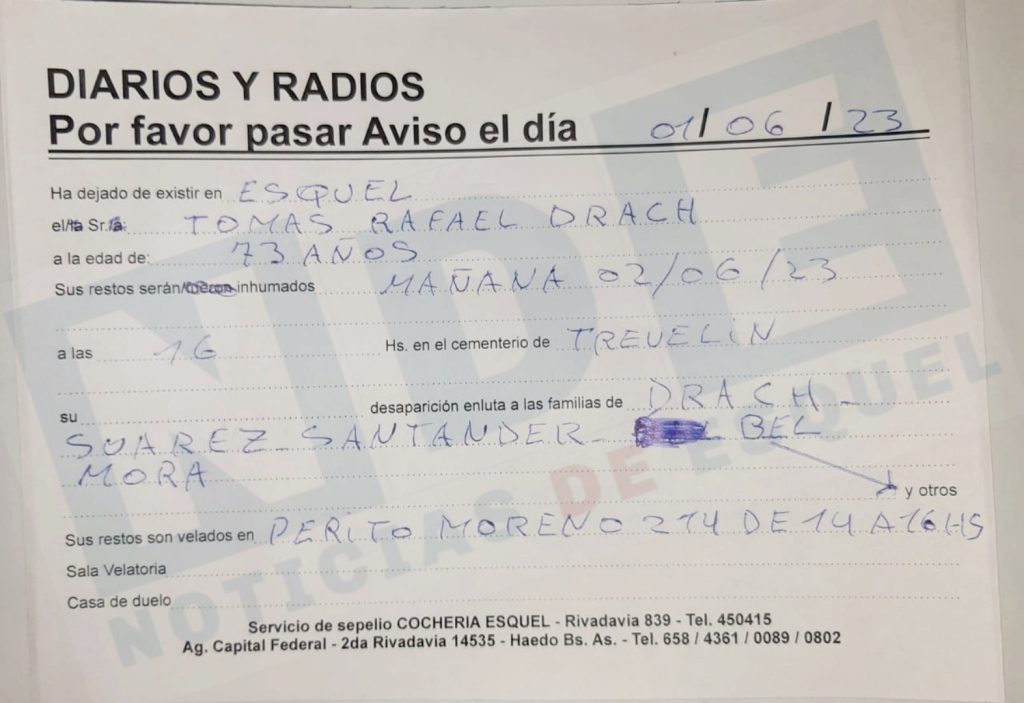 Su desaparición enluta a las familias Drach, Suarez, Santander, Bell, Mora y otras. Sus restos serán inhumados el viernes 2-6-23 a las 16 hs en el cementerio de Trevelin. Sus restos serán velados en Perito Moreno 214 de 14 a 16 hs.