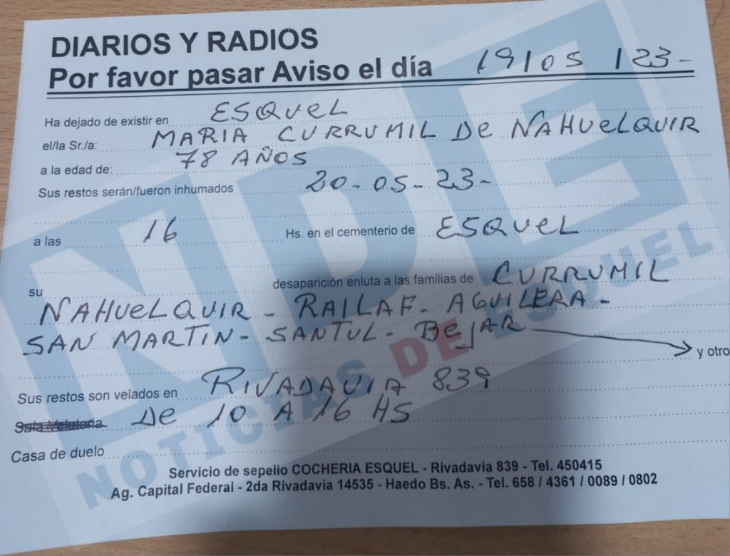 Sus restos serán inhumados el 22%5 a las 10 hs en el cementerio de El Maitén.