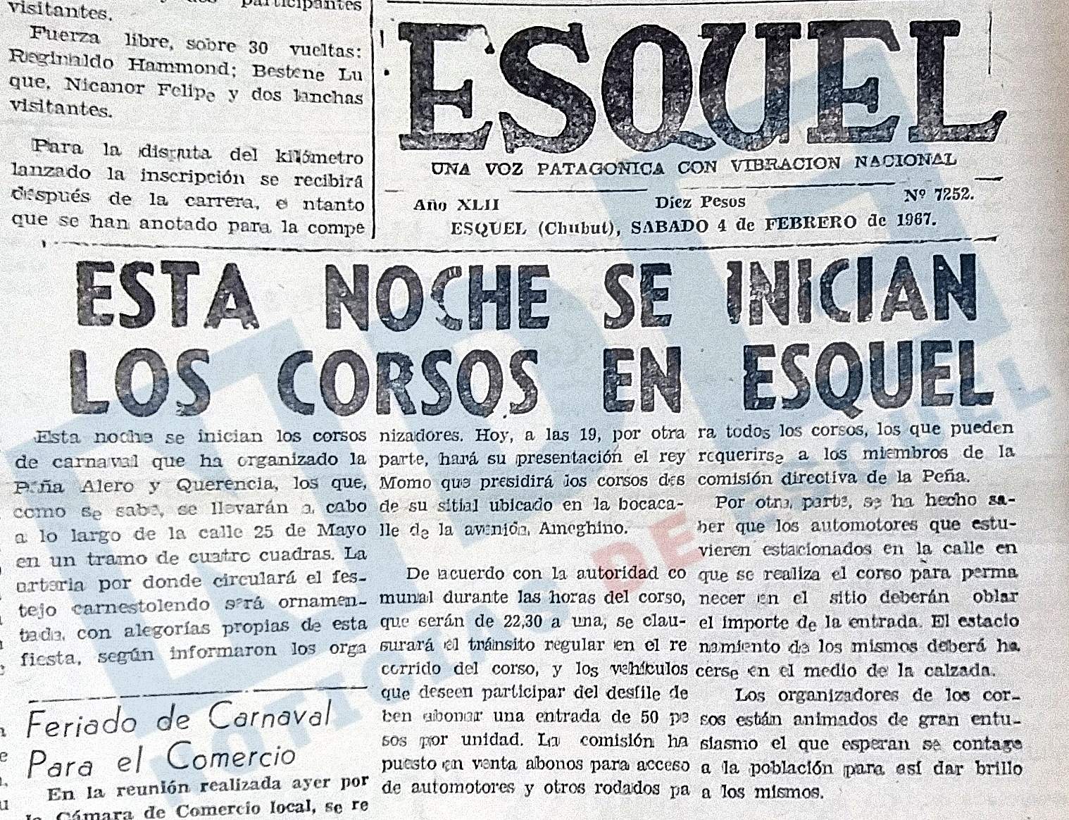 En su edición del sábado 4 de febrero de 1967, el Diario Esquel daba cuenta del inicio de los corsos de carnaval que eran organizados con gran entusiasmo por la peña Alero y Querencia. En ese momento se realizaban a lo largo de la calle 25 de mayo, por donde circulaban las carrozas ornamentadas con alegorías propias. Además había un Rey Momo que presidía los corsos desde su sitial ubicado en 25 de mayo y Ameghino. Durante las horas del corso de 22:30 a 01 hs, se clausuraba el tránsito por ese sector de la ciudad.