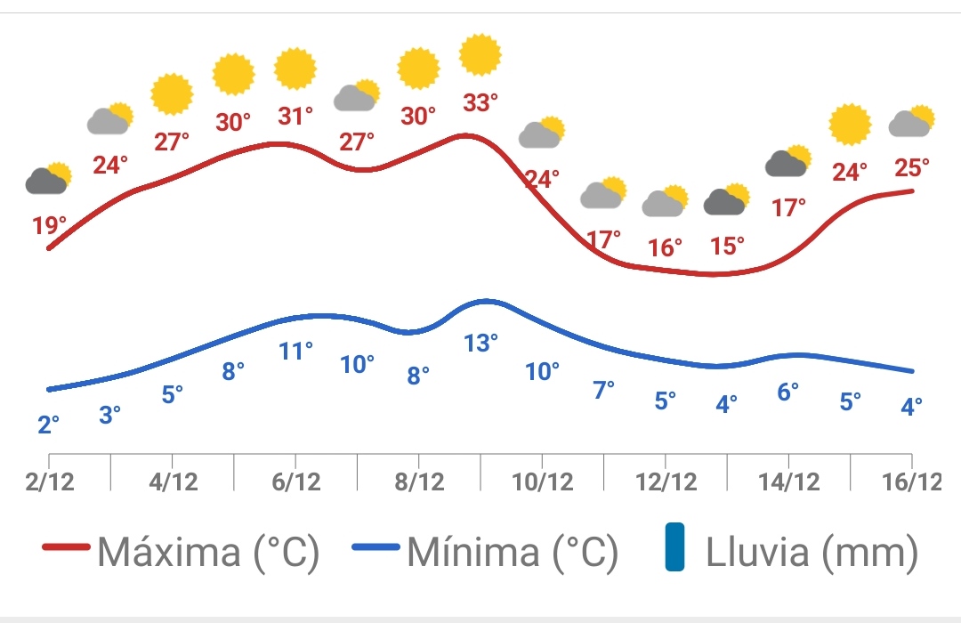 A partir del domingo 5 y hasta el jueves 9 de diciembre podría darse esta ola de calor que anuncian varios pronósticos climatológicos. Si bien algún sitio adelanta que durante esos días las temperaturas máximas podrían acercarse a los 29°, otros indican que esto podría ser aún más caluroso hasta llegar a superar los 30°.
