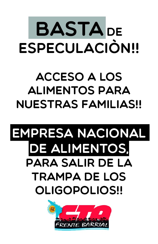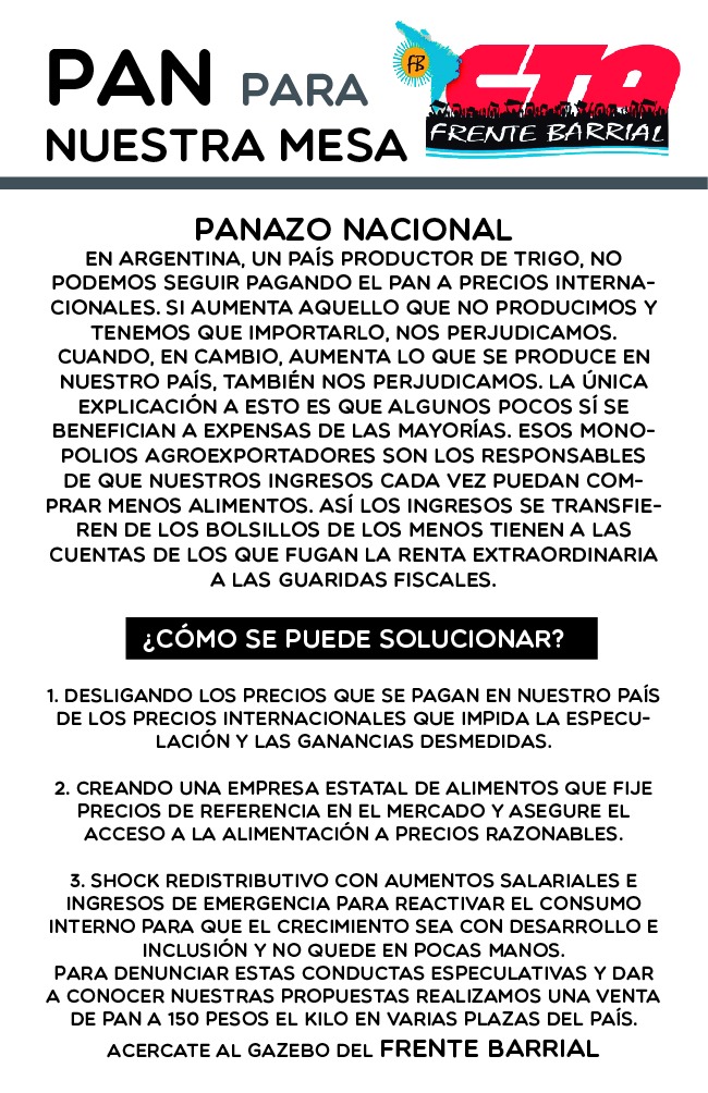Anuncian que esta jornada no es para nada una competencia con las panaderías, sino que están convencidos que vivimos en un país productor de alimentos y se debe priorizar que coman los argentinos y que los sectores concentrados que manejan el negocio dejen de especular.