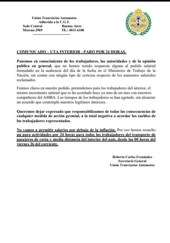 Por el paro decretado por la UTA Unión Tranviaria Automotor, este viernes no habrá servicio de transporte de corta y media distancia en el interior del país.