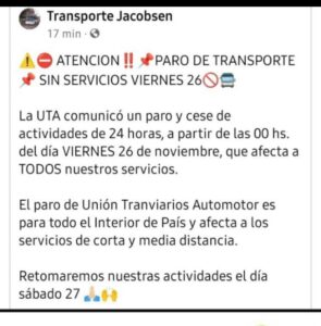 El paro comienza a las 00 hs del viernes 26 de noviembre y es por el lapso de 24 hs afectando el servicio de Transporte Jacobsen que no saldrá a Trevelín y sus parajes.