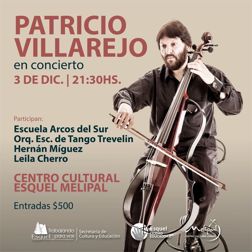 Patricio Villarejo es un músico argentino, chelista, compositor, director de orquesta, arreglador y productor que se presenta el viernes 3 de diciembre a las 21:30 hs en el Centro Cultural Esquel Melipal. Participan la Escuela Arcos del Sur, la Orquesta Escuela de Tango Trevelin, Hernán Míguez y Leila Cherro.