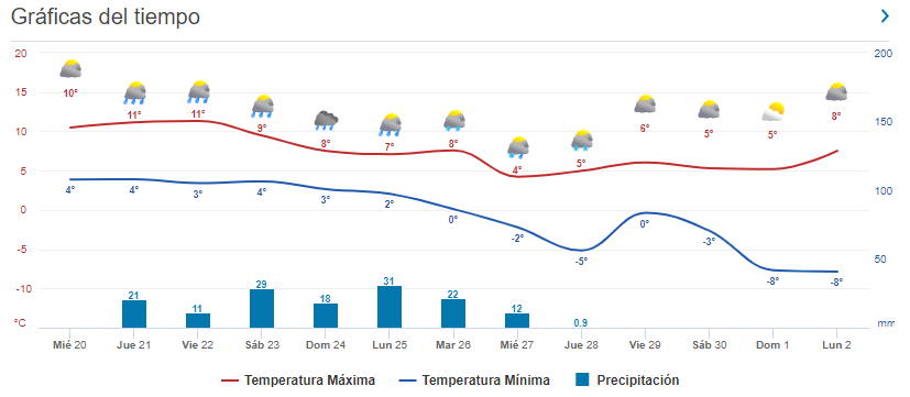Los pronósticos del tiempo anuncian para los próximos días lluvias intensas y nevadas, con viento y descenso de la temperatura. En el caso de las nevadas se anuncian de variada intensidad, algunas fuertes con una estimación de una acumulación que puede alcanzar entre 15 y 35 cms.