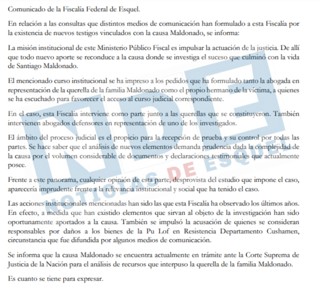 Comunicado de la Fiscalía Federal por las revelaciones del caso Maldonado