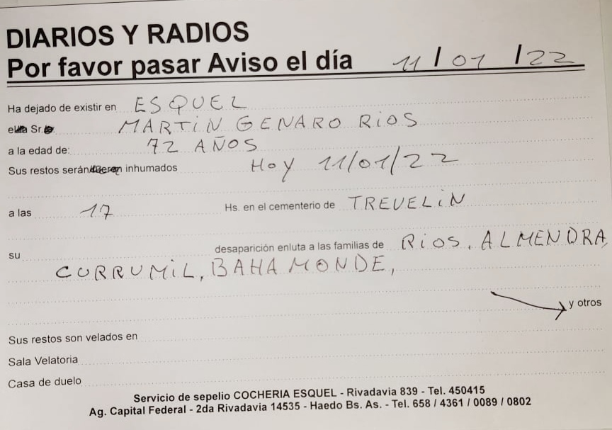 Necrologica Ha dejado de existir en Trevelin el Sr. RIOS GENARO MARTIN a los 72 años. Sus restos serán velados en la sala Velatoria de Trevelin desde las 13:00hs y a las 17:00 hs serán inhumados en el cementerio de esa localidad. Su sentida desaparición enluta a las familias: Ríos, Almendra, Baamonde, Steinkamps, Mardones, Currimil […]