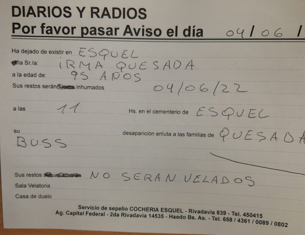 Ha dejado de existir en Esquel, la Sra Irma Quesada a los 95 años. No habrá velatorio y sus restos serán inhumados el sábado 4/6 a las 11 hs en el cementerio de Esquel. Su sentida desaparición enluta a las familias Quesada, Buss y otras. Servicio de sepelio Cochería Esquel.