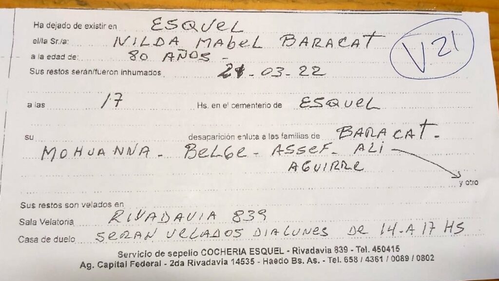 Ha dejado de existir en Esquel la Sra. Nilda Mabel Baracat a los 80 años. Sus restos serán inhumados el 21-3-22 a las 17 hs en el cementerio de Esquel. Su desaparición enluta a las familias Baracat, Mohuanna, Belge, Assef, Ali, Aguirre y otras. Sus restos serán velados el lunes 21 de 14 a 17 […]