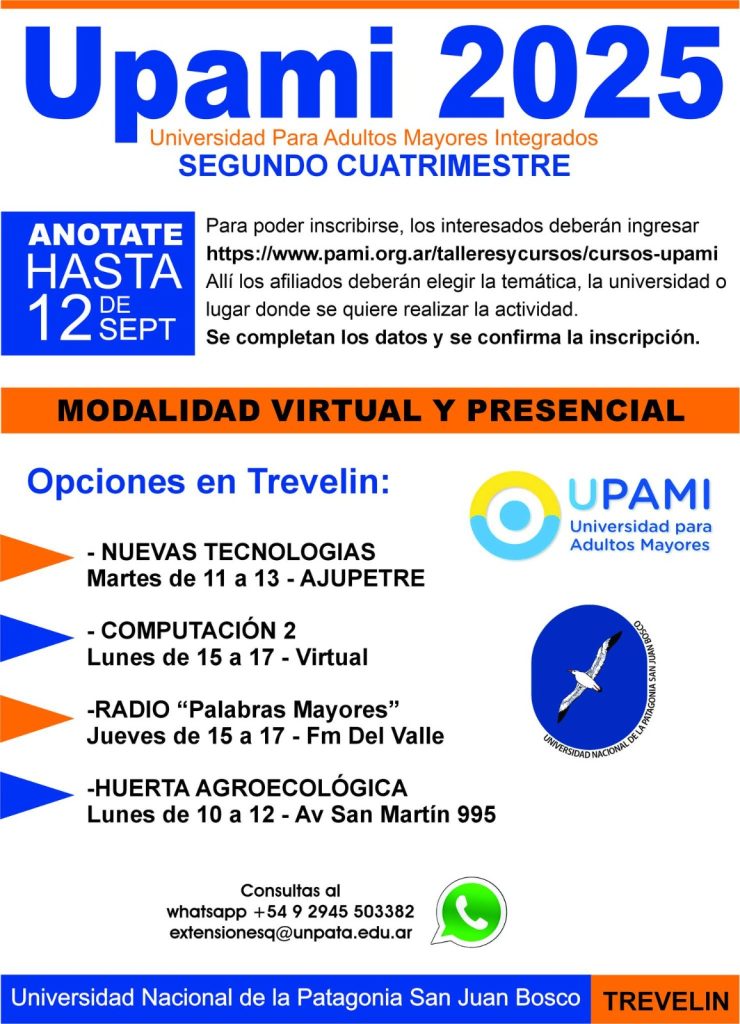 Hasta el 12 de septiembre se pueden anotar.📝 Habrà actividades en Esquel y en Trevelin.‼️🫂Continúa el trabajo de la Sede Esquel de la UNPSJB con los Talleres UPAMI dispuestos para los adultos mayores de Esquel y Trevelin. En esta segunda parte del año, además de los talleres presenciales también habrá talleres virtuales para que se […]