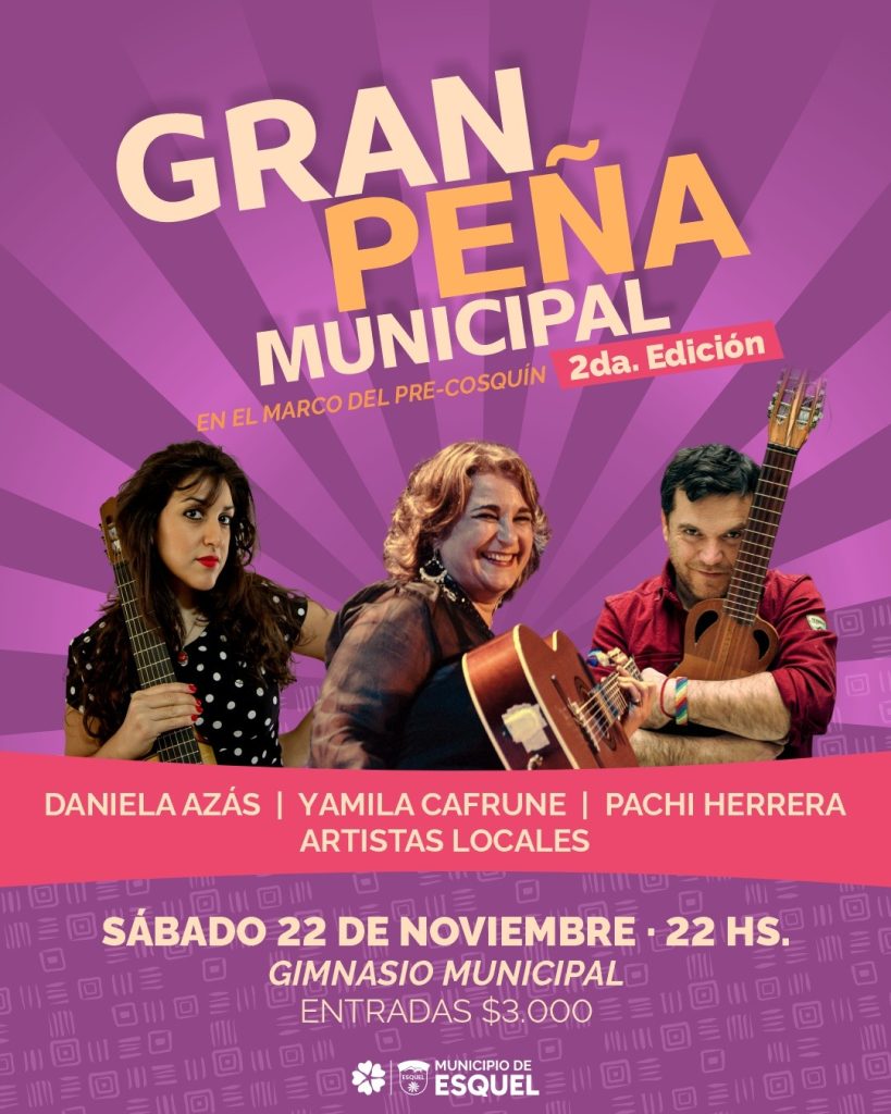 El 12 de noviembre es el último día de inscripción para cantores y bailarines que quieren participar del Pre Cosquín en Esquel. Yamila Cafrune, Pachi Herrera y Daniela Azás se presentarán en la Peña Municipal junto a Quebracho y Agustin Acuipil de Esquel. El 10 de noviembre comenzará la venta de entradas para la Peña a 3000 pesos.